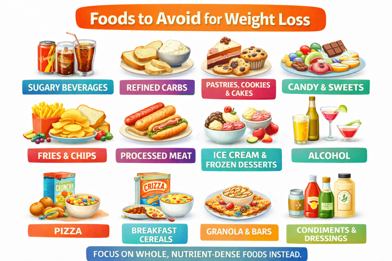 The common thread among foods to avoid for weight loss is that they’re highly processed, calorie-dense, nutrient-poor, and engineered to encourage overeating. They provide lots of calories with minimal satiety, disrupt blood sugar regulation, and can trigger cravings.