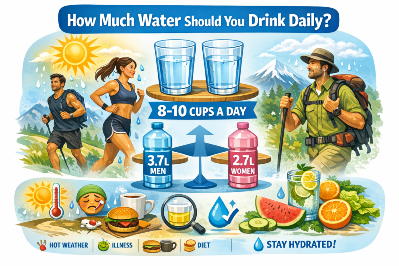 General recommendations suggest about 8-10 cups of fluids daily for women and 10-12 cups for men, though individual needs vary based on activity level, climate, and body size. You can tell you’re well-hydrated when your urine is pale yellow rather than dark or concentrated.